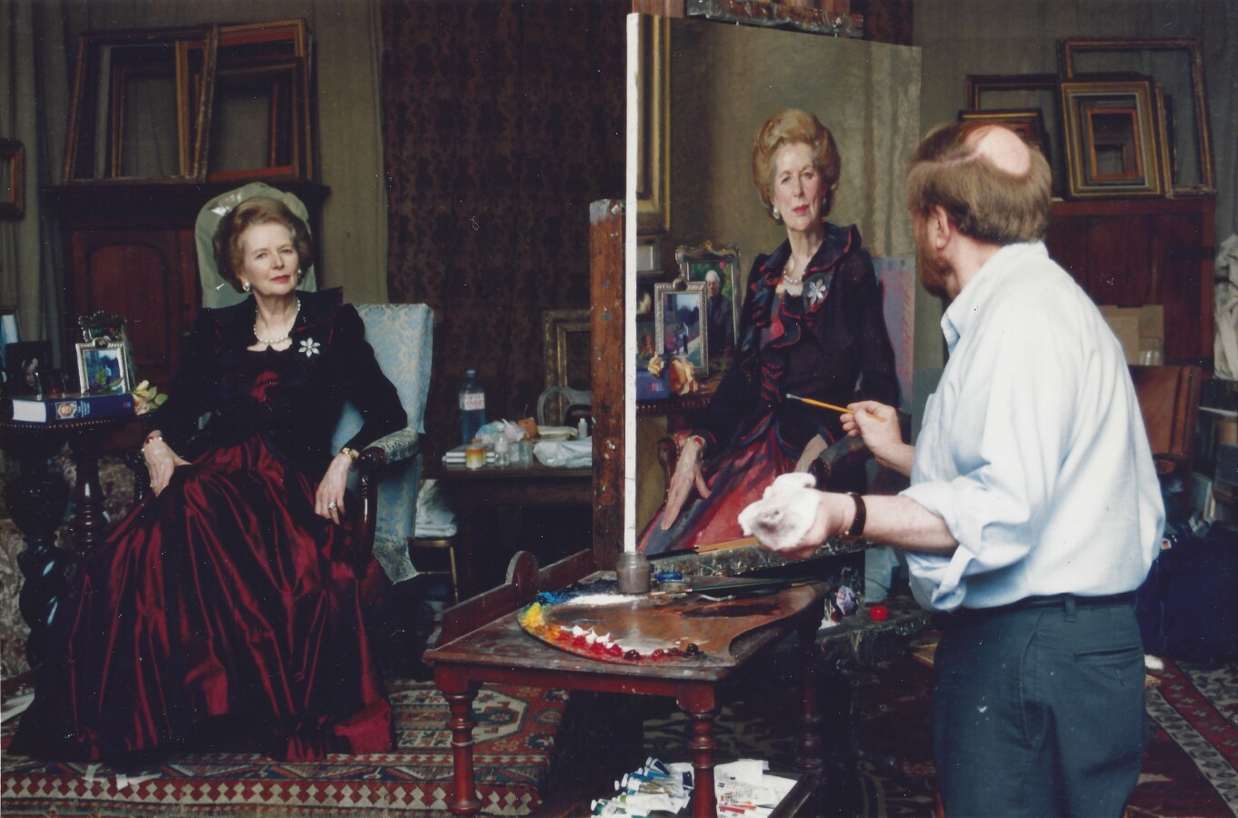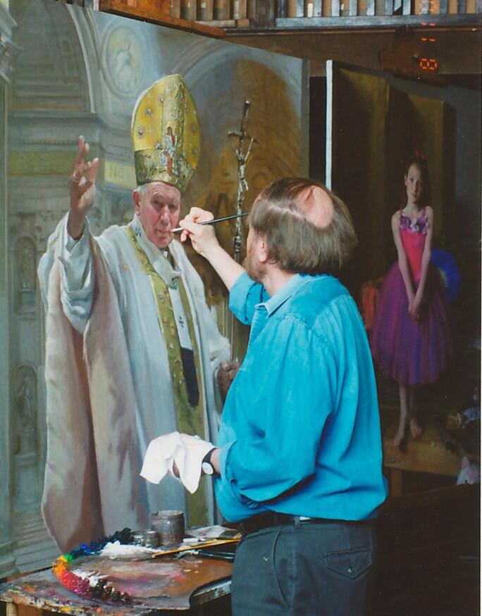 Nelson Shanks was unsurpassed as a practitioner and teacher of traditional painting techniques handed down from the Italian Renaissance. Most formative was his time in Florence at the Accademia de Belle Arti studying under Pietro Annigoni (1919–1988), the eminent and outspoken classical realist who became a model for Shanks’s career. Annigoni had studied the techniques of the Renaissance masters and, as a portraitist, had welcomed commissions of celebrated sitters. Just as Annigoni portrayed Queen Elizabeth II, Pope John XXIII, and John F. Kennedy, so Shanks would eventually paint portraits of Ronald Reagan (see lot 112), Margaret Thatcher (fig. 1), Princess Diana (see lot 110) and later her brother Lord Spencer (both portraits now at Althorp), and Pope John Paul II (fig. 2).